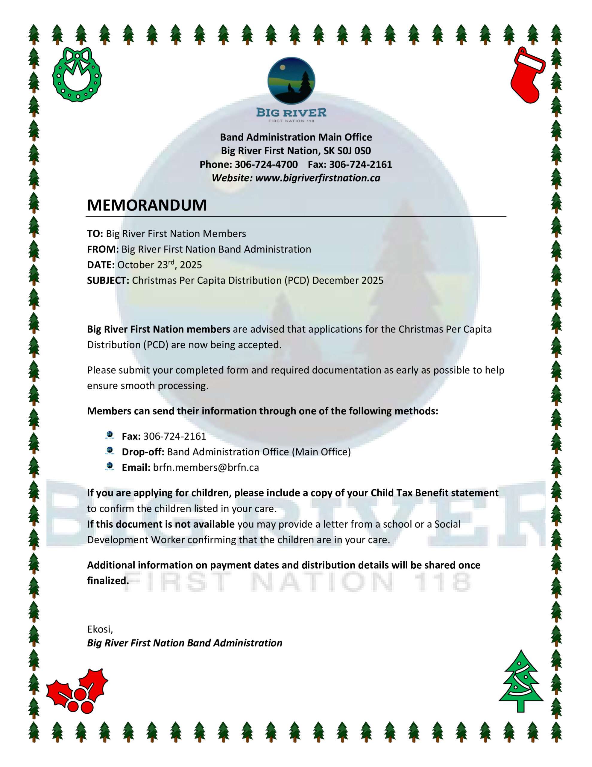 Big River First Nation is now accepting applications for the Christmas Per Capita Distribution (PCD).